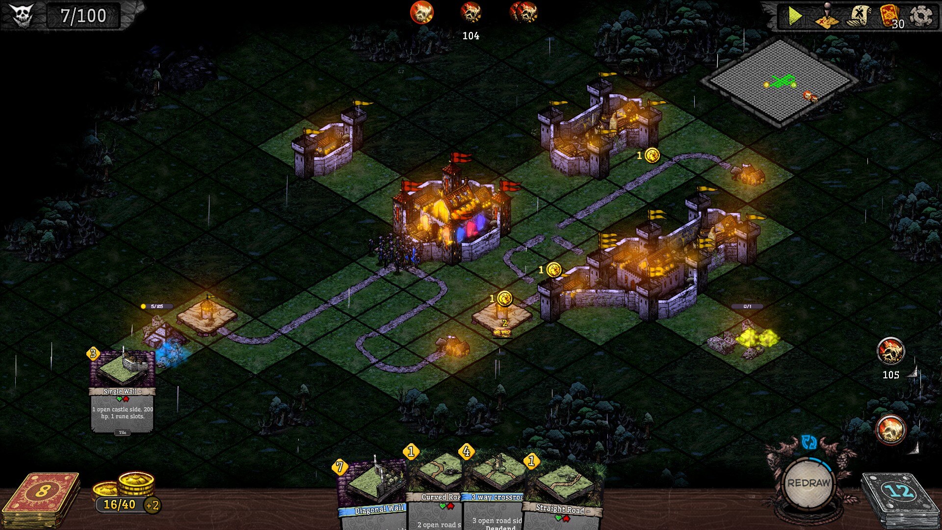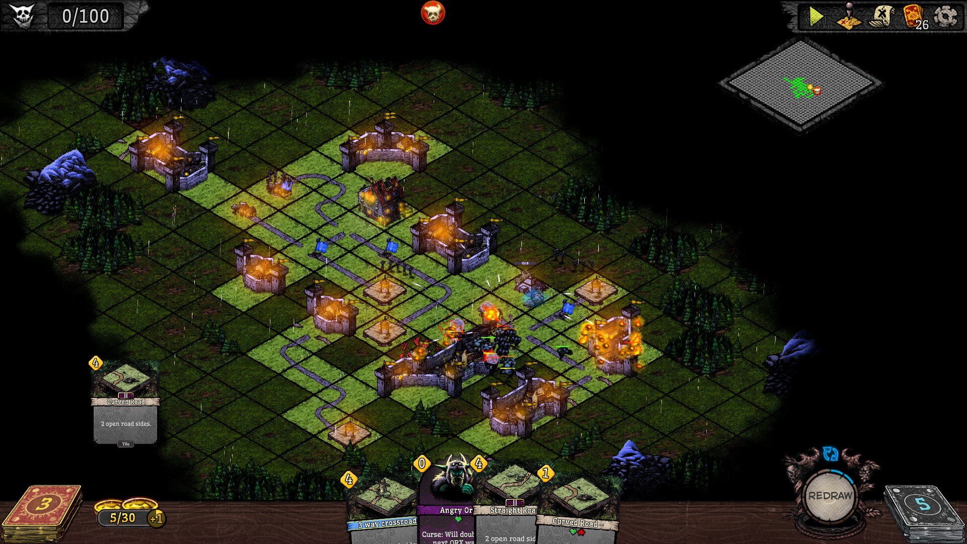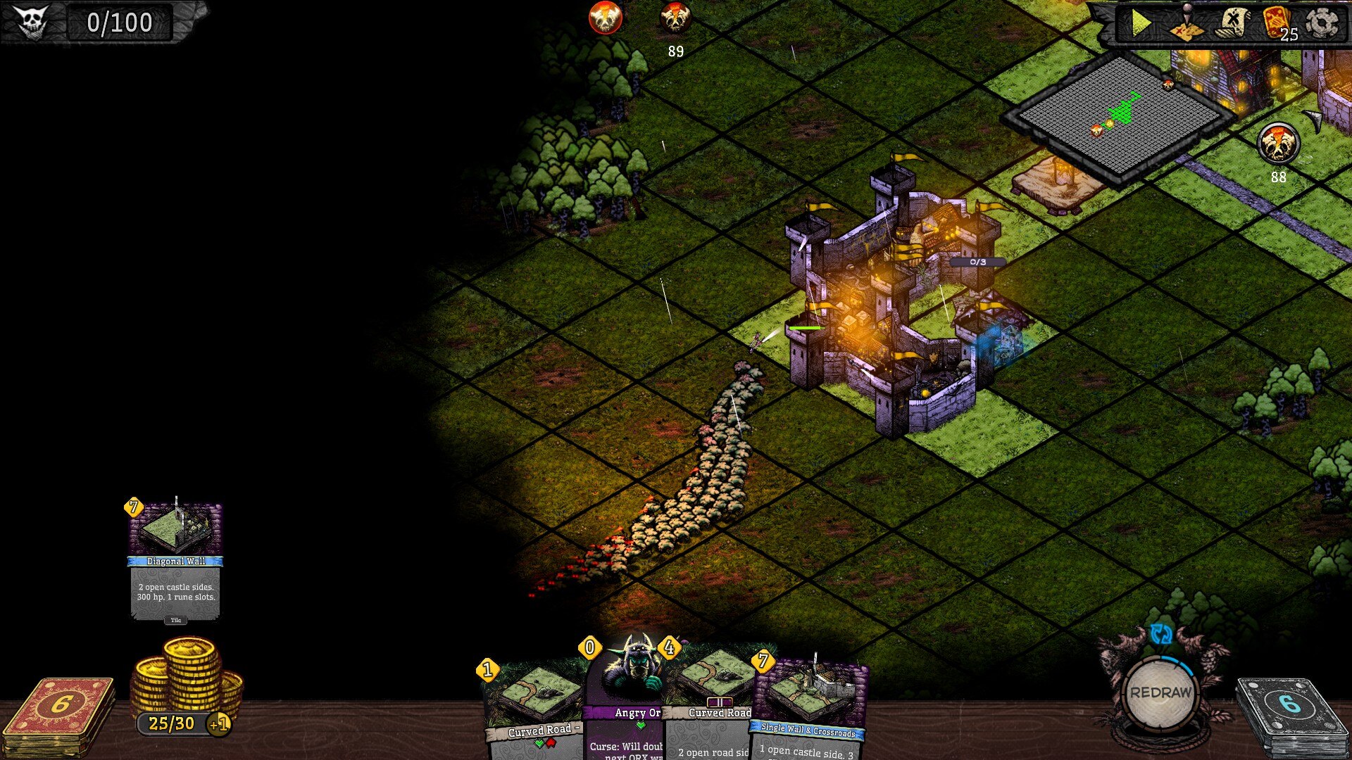 Luckily, when an Orc wave is ended your buildings and troops regenerate their health in anticipation of the next wave. There are some mechanics in place that can make the next challenge you face a bit more intense. There are curse cards that get added to your deck and the only way to remove them is by using them or being fortunate enough to be granted the ability to remove a card as a benefit from unlocking one of the vaults shown on your map. Vaults are special tiles on your map that you can unlock by completing its listed requirements. They typically allow you to add or remove a card from your hand. The curse card seen most often in the demo doubles the size of the next wave, which can be devastating to any run if you’re not prepared.