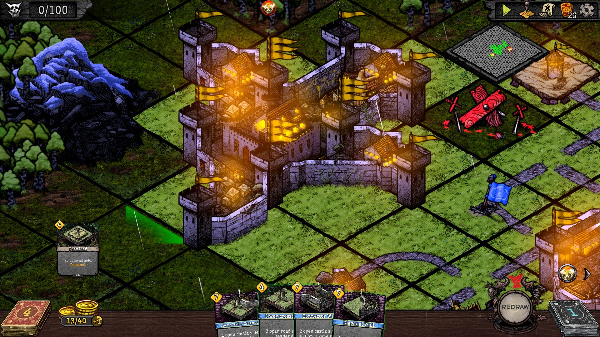 You slowly generate gold as the game goes by and placing pieces such as villages or farmland can help you generate gold faster, with there also being some relic cards that assist with it as well. This means not only are you restricted in what you can place because of the deckbuilding mechanics, but you also have to manage your resources. Running out of gold at the wrong moment can be a run ending mistake and you’ll more often than not be attempting to fight off a hoard of Orcs during all of this.