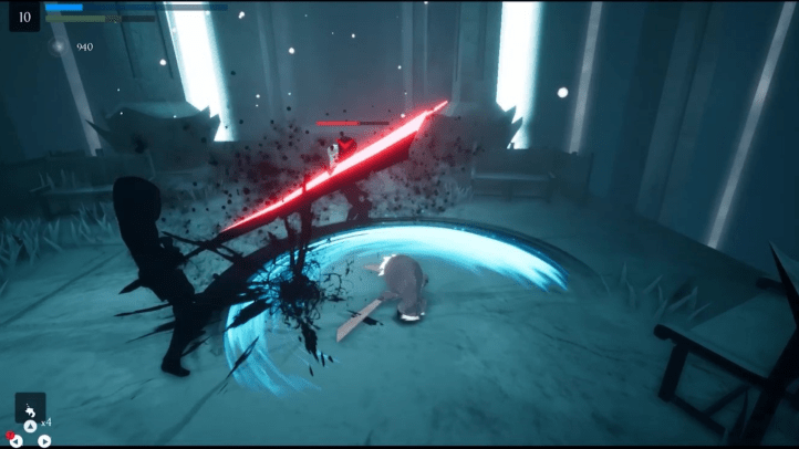 A mixture of combat and platforming is the best summation of the gameplay for Blue Fire. While the former is very bare-bones, the latter is very well executed. The combat mostly boils down to slashing with a sword by pressing one button, and eventually using an unlockable projectile that spends magic energy. These two elements alone make the combat simple but relatively effective, and eventually, a spin attack is added – which is used more for platforming than actual combat, due to the lift it gives you when using it. The combat works for what it is, but it feels like there could be so much more to it. The platforming on the other hand works very well. All the moves you’d expect from modern platformers are here: double-jumps, dashes, air-dashes, wall running and more. There is a definite looseness to these controls which works well with the environments called ‘voids’ which are where most of the platforming takes place.