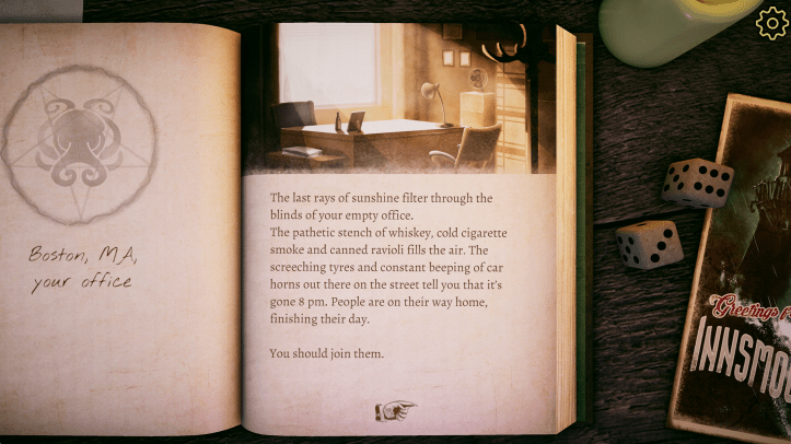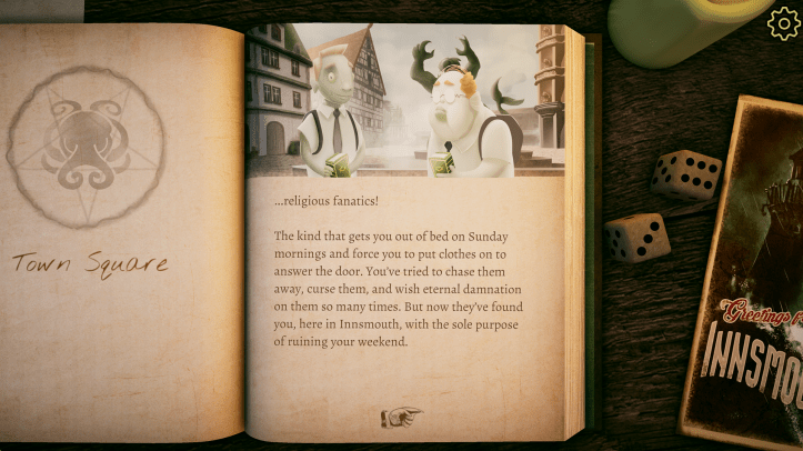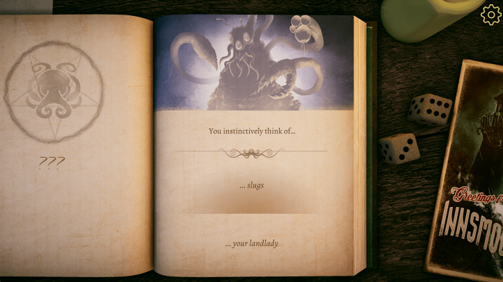 The whole of The Innsmouth Case takes place within a book on a table, and this limited presentation works very nicely. I liked the feeling of sitting down with a book in the game, and the animated art for the characters was all very well done. When the Lovecraftian monsters did show up, they were always a good mix of awesome and horrifying, and made me wish the game had leant into the horror more. However, the only thing that let the game down in presentation was the writing itself. Missing full stops, misplaced hyphens, and lines like ‘You blink your eyes that feel crunchy and dry’ are some of the annoyances that can take you out of the experience.