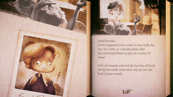The Innsmouth Case begins with the exact same scenario as 2018’s Call of Cthulhu: you are an alcoholic and failing private investigator slumped in your office, when a case walks in the door and prompts you to go to a secluded coastal town where (most likely) the residents are members of an Ancient One-worshipping cult. The first character introduced to you is Dahlia Marsh, the game’s femme fatale who asks you to find her missing daughter. While I found the writing and characters to be cliché, it was soon clear that these clichés were being used for comical effect. When Dahlia shows you a photograph of her daughter, Tabitha, the camera zooms in on the child’s face with dramatic music, and the detective character you play as comments on the strange appearance of the child.