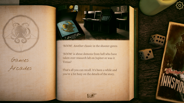 When it comes to the music, at first it was sufficiently eerie and haunting, but as the game went on the repetitive piano motif became nauseating and actually distracted me from reading the words on the screen. The moment I enjoyed, however, was the Arcade area where the motif shifted into a retro synth beat. I particularly liked the poorly-masked parodies of games in the first-person shooter genre too, like ‘Maison of the Unliving’ or ‘BOOM!’, which had its own recognisable rock soundtrack when you played it. These moments restored my faith in The Innsmouth Case, but unfortunately they were too rare to sustain me.
