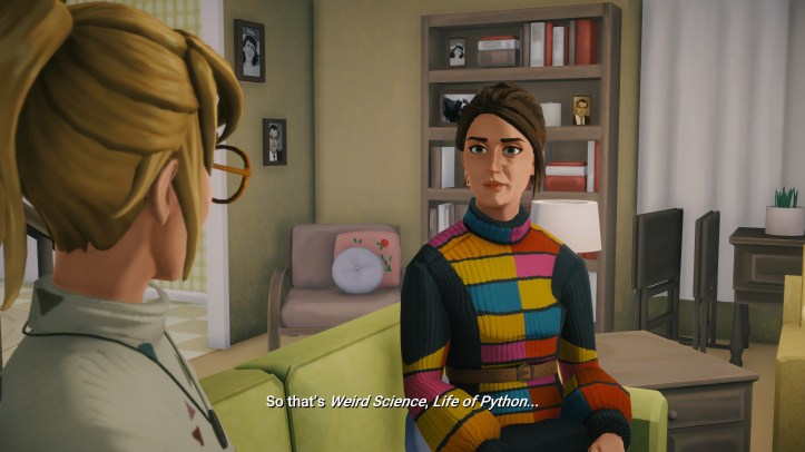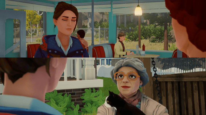 The primary gameplay of Lake is carrying out the role of the local mailperson in town whilst Meredith is spending time away from her job in the city. This gameplay involves driving around town and delivering to different addresses. This is how Meredith will interact with different townsfolk and learn about the different businesses and relationships. Driving is very relaxing, allowing you to take in the beautiful scenery of Providence Oaks. Your postal van controls very simply, and it’s enjoyable to cruise to your different delivery locations whilst listening to the radio. During your deliveries, you are able to speak with the townsfolk, and this is where the game’s dialogue options become a major component. For example, when talking to an elderly lady with a sick cat, Meredith can offer to deviate from her deliveries to take the cat to a vet, which in turn gives you more interactions the following day. During my playthrough, I spent time interacting heavily with the VHS rental store owner. Dialogue responses are fairly varied – for example, in some of the interactions with the store owner, Meredith is able to be lightly flirtatious if the player is interested. Additionally, you can take on activities during the day that give you opportunities in the evening.