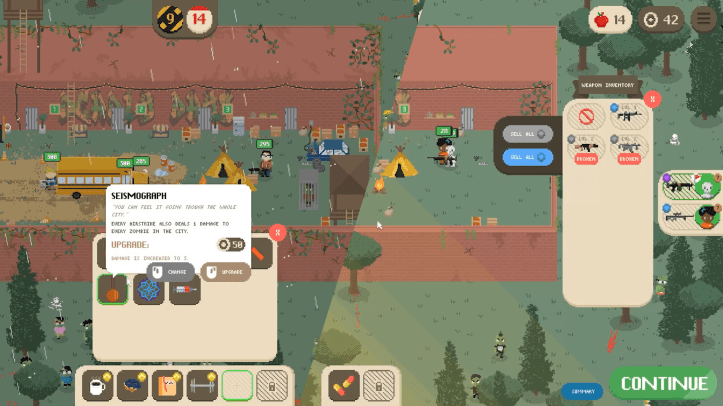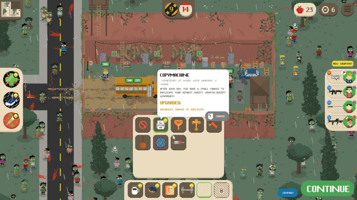 You’ll also need to effectively manage the equipped weapons of your group. Weapons come in the form of guns and melee weapons – melee helps in clearing hordes when surrounded and they do not need to be reloaded, whereas ranged weapons can help to cut hordes down to more manageable sizes. These weapons also come in different levels of rarity and can add different bonuses, such as clip size and fire rate. Tools also act as a currency to develop permanent base upgrades, such as a space laser that replaces your airstrike or a farm that allows you to grow food but choose wisely as you’ll only have 3 slots per run.