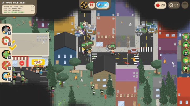 In terms of presentation, the game’s visuals are basic but have a charming level of character to them. Watching the bouncy characters hop along the zombie-infested streets is always fun to see, and the game’s enjoyable if sometimes repetitive soundtrack fits perfectly with the light and silly tone.