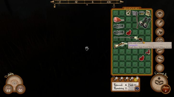 I also really appreciate that the game gives enemies clear animations that signal opportunities to attack. For example, standard hunters will need to reload their shotguns after two shots, or they may become startled when you kill one of their colleagues, opening them up for an easy axe swing. The limited inventory space does a good job of making sure you never feel overpowered. It forces you to decide what kind of items you want to prioritize collecting – guns take up a lot of space, whereas distraction items take up considerably less space. You’ll also need to grab as many items as you can from nearby houses and cabins in order to maintain things like your hunger or having enough bandages on hand to heal a severely bleeding wound. More unique items can also be found in these houses if the RNG is kind to you, such as the tracker that points you in the direction of the nearest stone piece, or maybe a trombone that can be used to draw enemies.