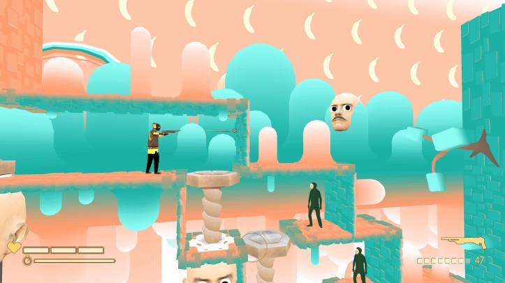 To put it in a single sentence, the plot of this game is insane, funny and very off the wall. While the gameplay is very ‘action movie’ in its approach, the story is more of an acid trip as you adventure through many environments with your floating banana friend Pedro. The protagonist wakes up in a butcher shop with the aforementioned Pedro telling the player of what has previously occurred, sending the player on a path of revenge. It’s a very simple plot concept but I feel the writing still holds up to make the game feel more unique than the base concept with a great deal of humour and takes pleasure in the absurdity of what is happening within it. The plot takes a back seat to the gameplay and aesthetics, but the effort is still put into making the story not feel boring.